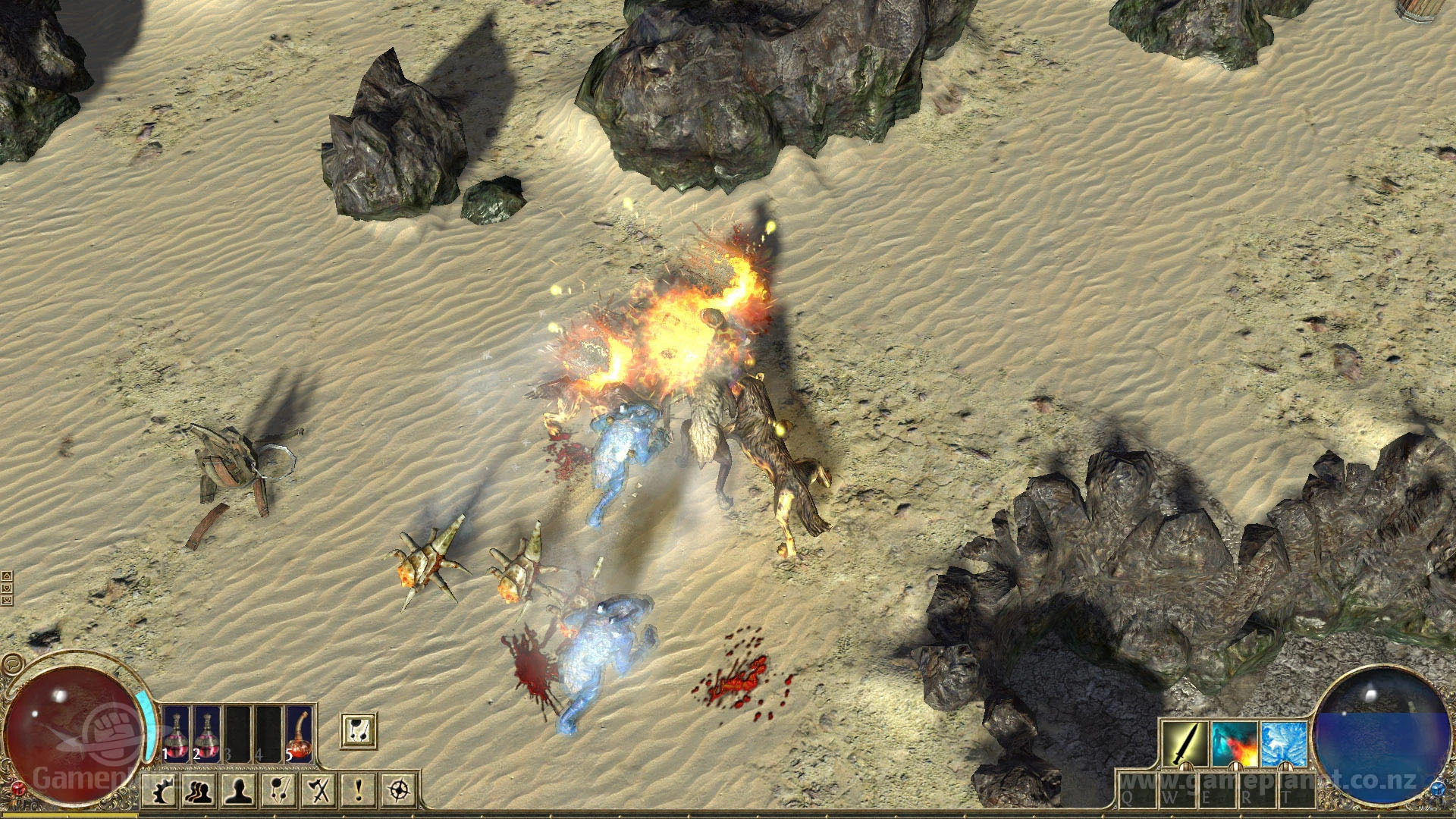- Monsters in this area include goat men, hellions, skeletons, rhoa, scavengers, zombies, and sand spitters.