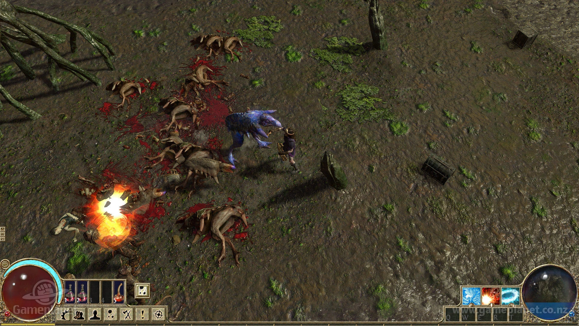 A witch battles a champion rhoa in the Mud Flats.